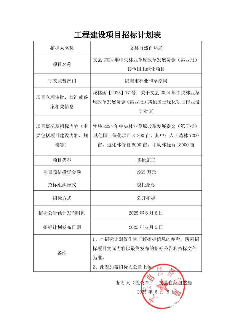 附件:文縣2024年中央林業(yè)草原改革發(fā)展資金(第四批)其他國(guó)土綠化項(xiàng)目招標(biāo)計(jì)劃表.pdf