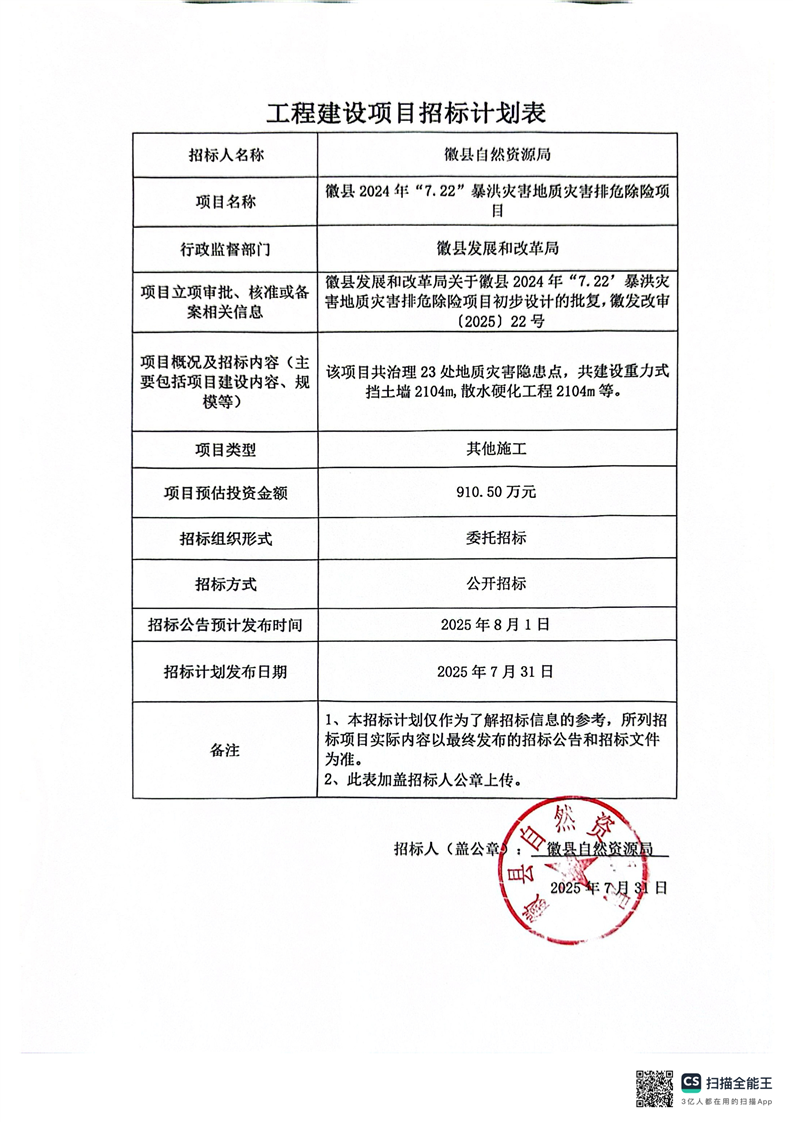 徽縣2024年“7.22”暴洪災(zāi)害地質(zhì)災(zāi)害排危除險(xiǎn)項(xiàng)目