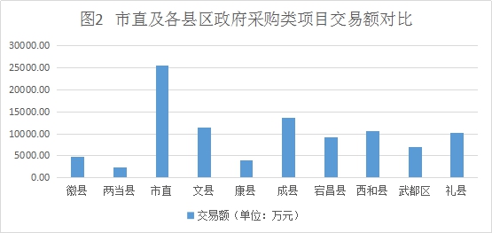 2.政府采購(gòu)類(lèi)項(xiàng)目:市直45項(xiàng),交易額25563.29萬(wàn)元;武都區(qū)36項(xiàng),交易額6990.89萬(wàn)元;成縣34項(xiàng),交易額13577.85萬(wàn)元;徽縣20項(xiàng),交易額4778.48萬(wàn)元;西和縣34項(xiàng),交易額10655.60萬(wàn)元;禮縣35項(xiàng),交易額10150.20萬(wàn)元;康縣23項(xiàng),交易額3886.56萬(wàn)元;文縣36項(xiàng),交易額11436.30萬(wàn)元;宕昌縣35項(xiàng),交易額9173.00萬(wàn)元;兩當(dāng)縣14項(xiàng),交易額2284.08萬(wàn)元。