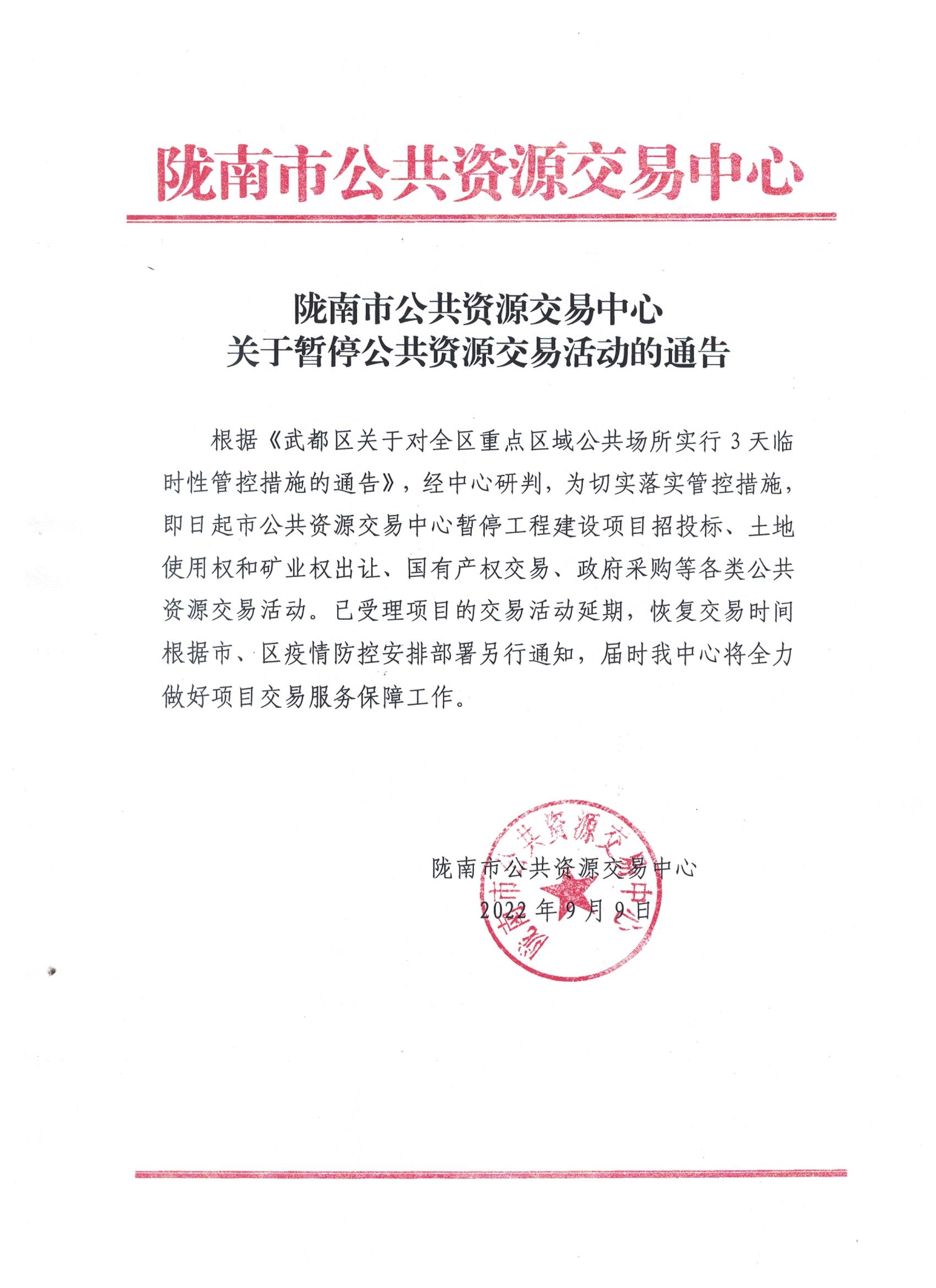 隴南市公共資源交易中心關于暫停公共資源交易活動的通告