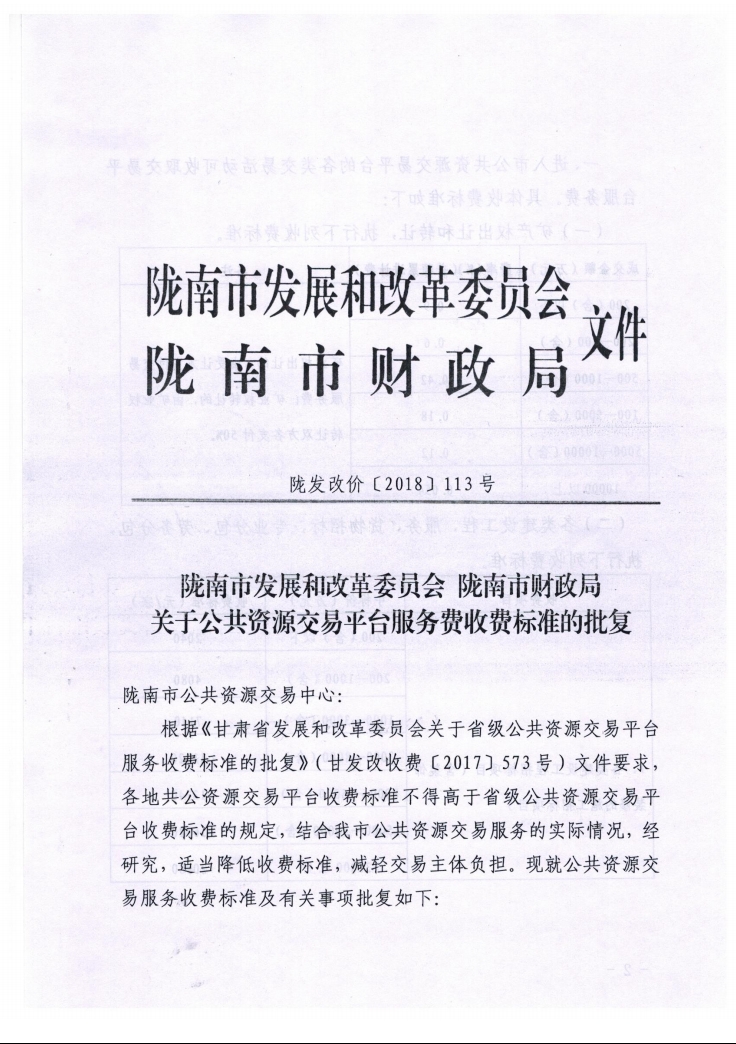 隴南市發(fā)展和改革委員會 隴南市財政局關(guān)于公共資源交易平臺服務(wù)費收費標(biāo)準(zhǔn)的批復(fù)